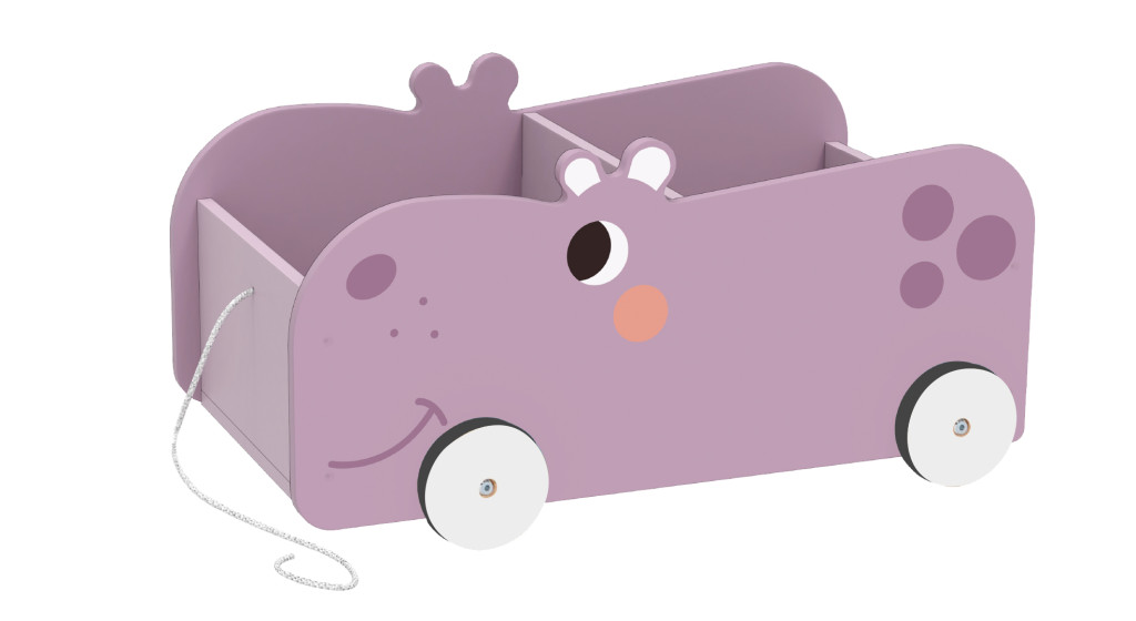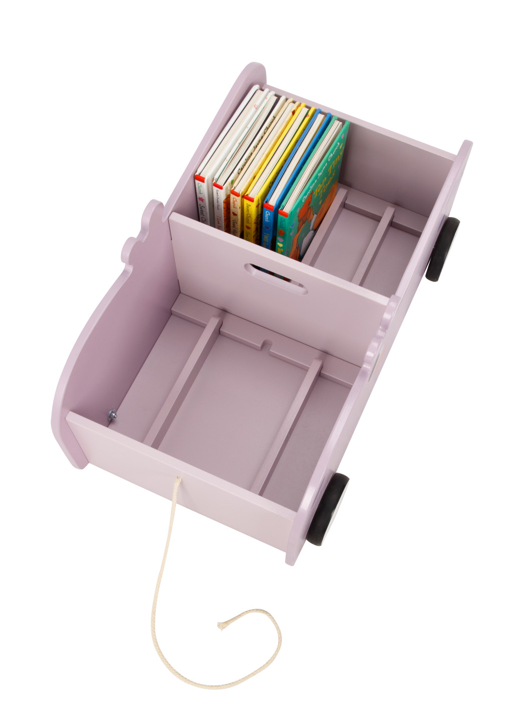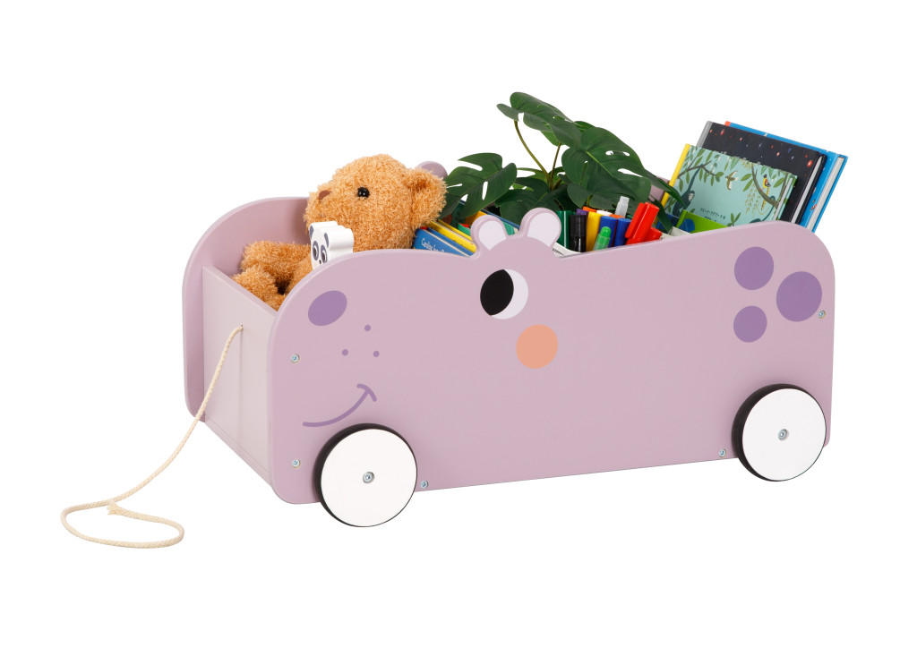 Prevăzută cu roți și șnur pentru tras, cutia este ideală pentru păstrarea cărților, jucăriilor, materialelor de desen sau plușurilor, sprijinind în același timp dezvoltarea coordonării motrice și a independenței prin joacă. Designul vesel în nuanțe pastelate de mov, fața prietenoasă și compartimentarea practică fac din acest cărucior un element perfect pentru orice cameră de copil.